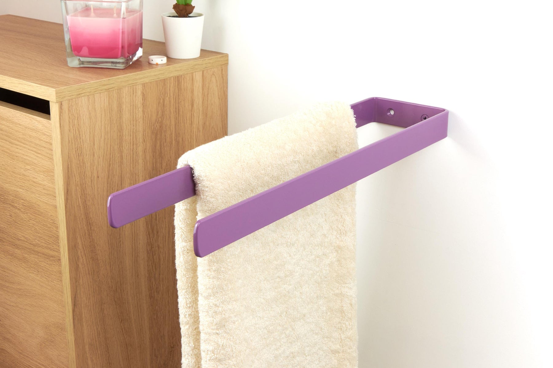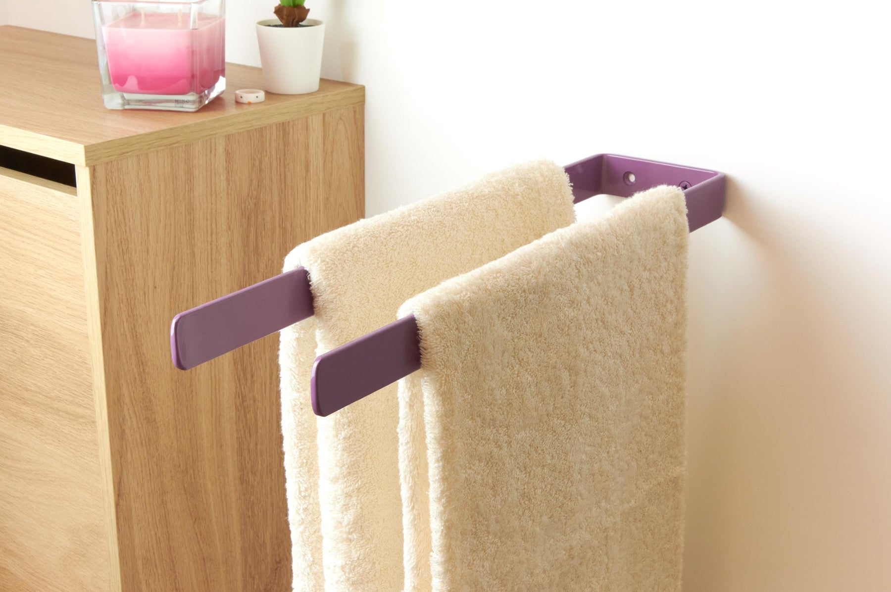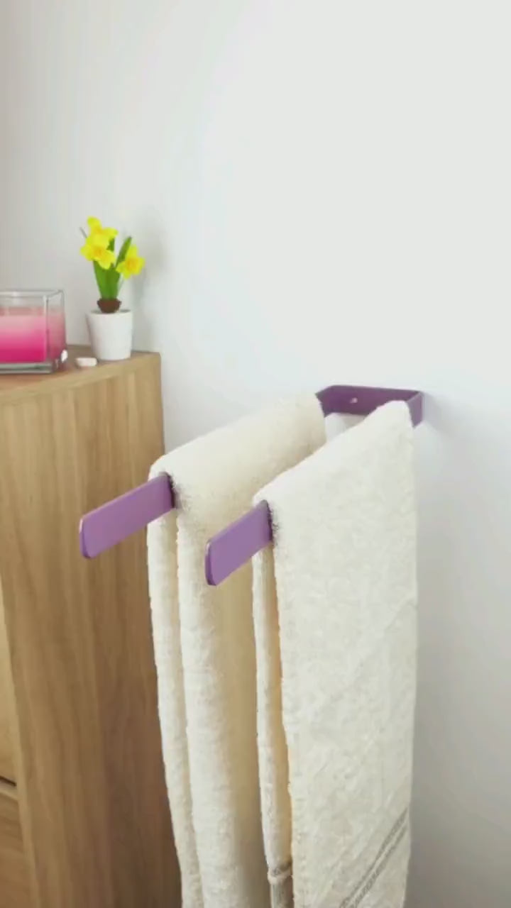 This double vibrant metal towel rack with a sleek minimalist design offers a functional dual towel rack solution for modern bathrooms! The color of the product in the pictures is Violet.