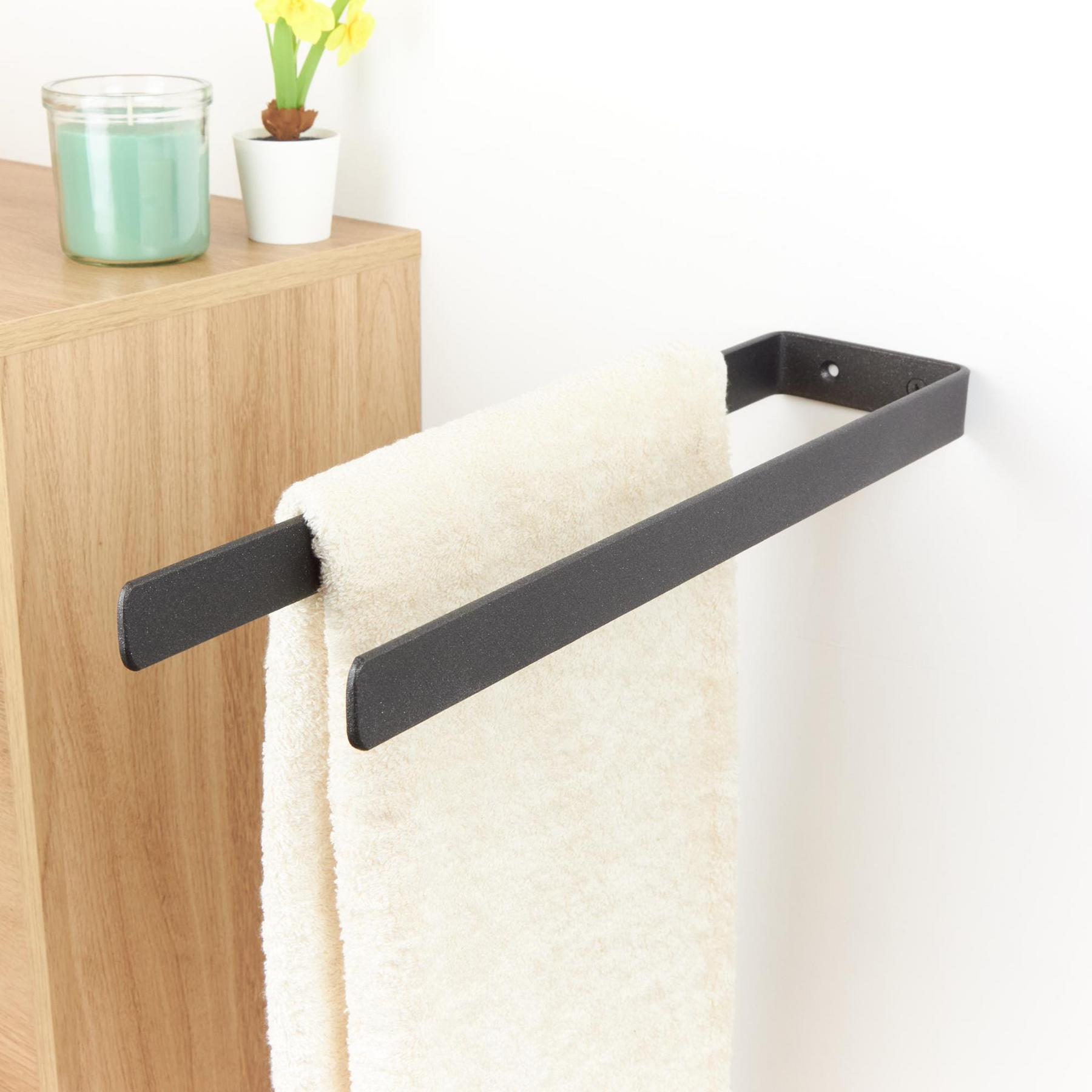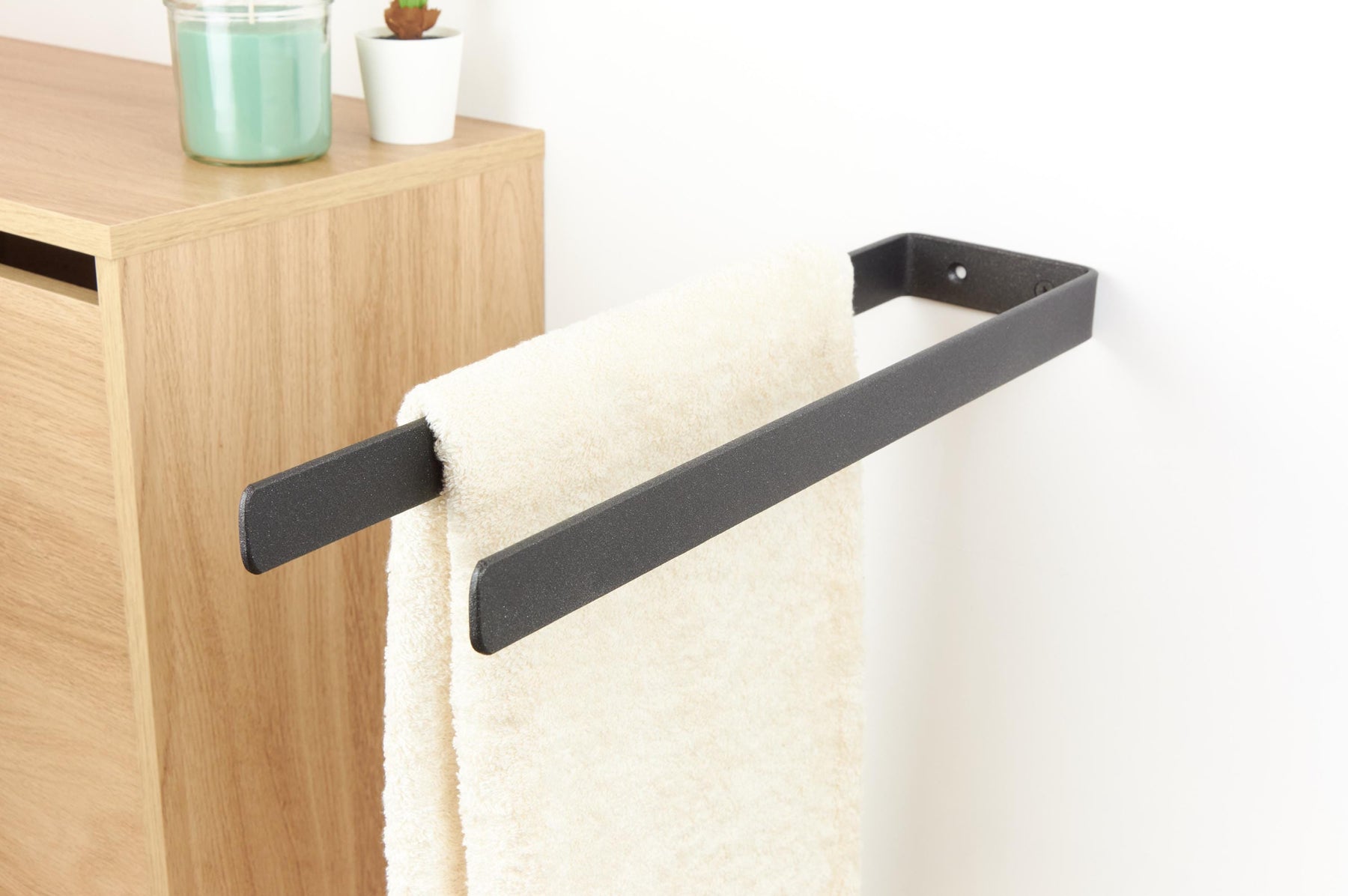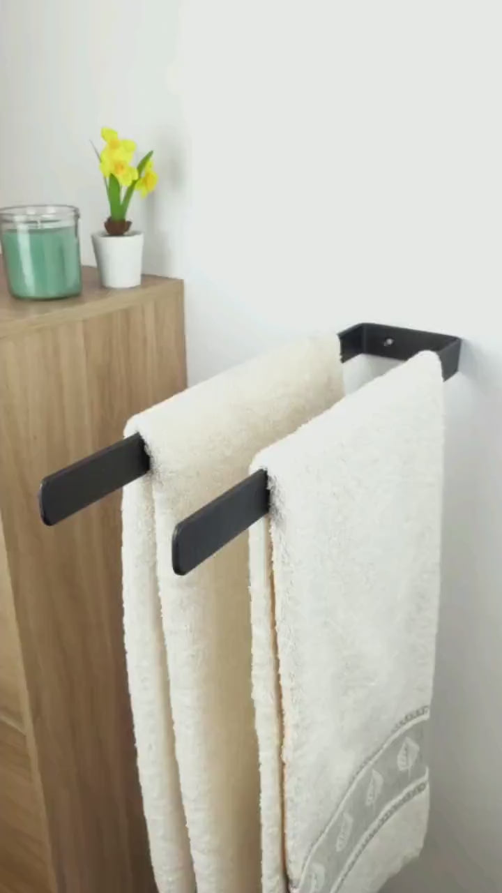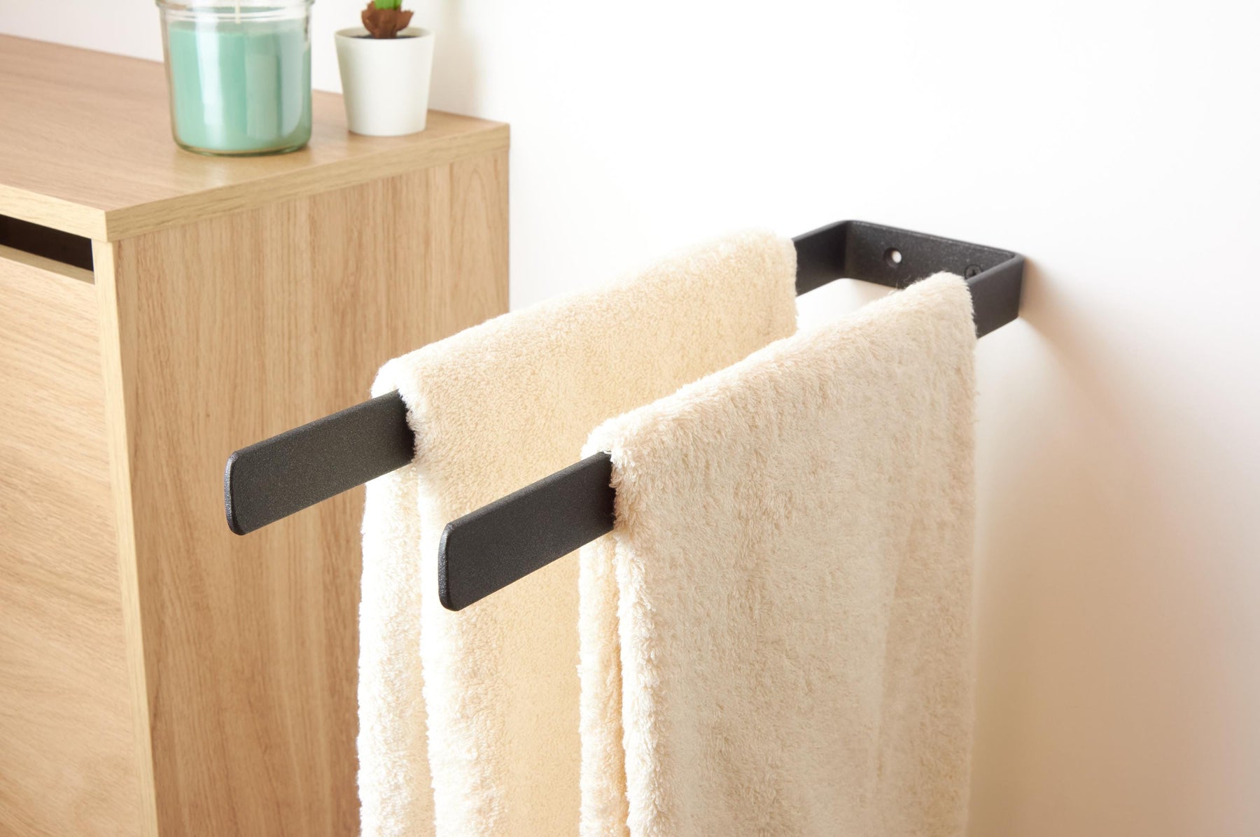 This double towel holder is a durable wall mounted bathroom towel bar designed for space-efficient bath storage! The color of the product in the pictures is Sand Textured Black.