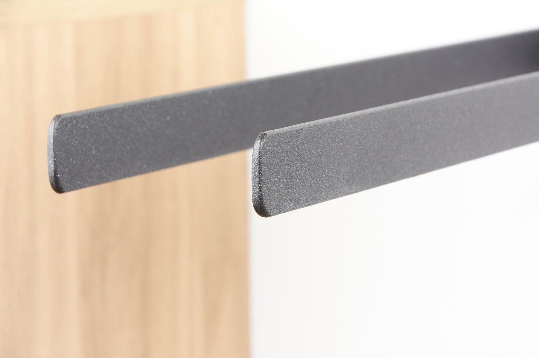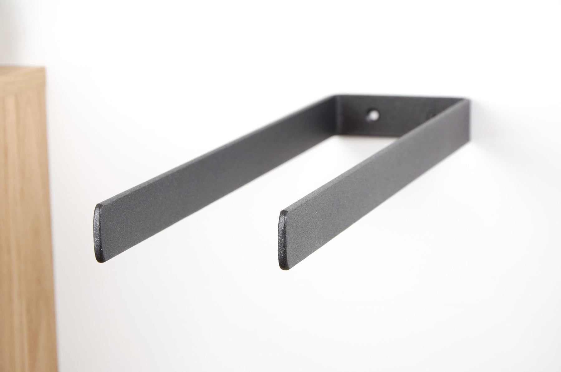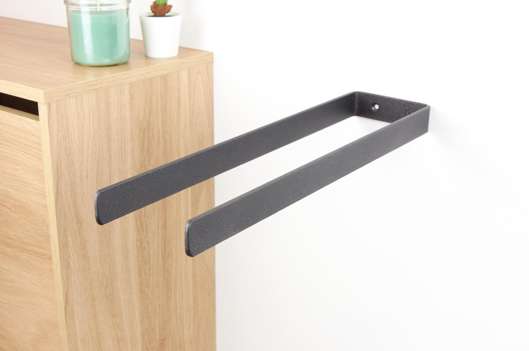 This double towel holder is a durable wall mounted bathroom towel bar designed for space-efficient bath storage! The color of the product in the pictures is Sand Textured Black.