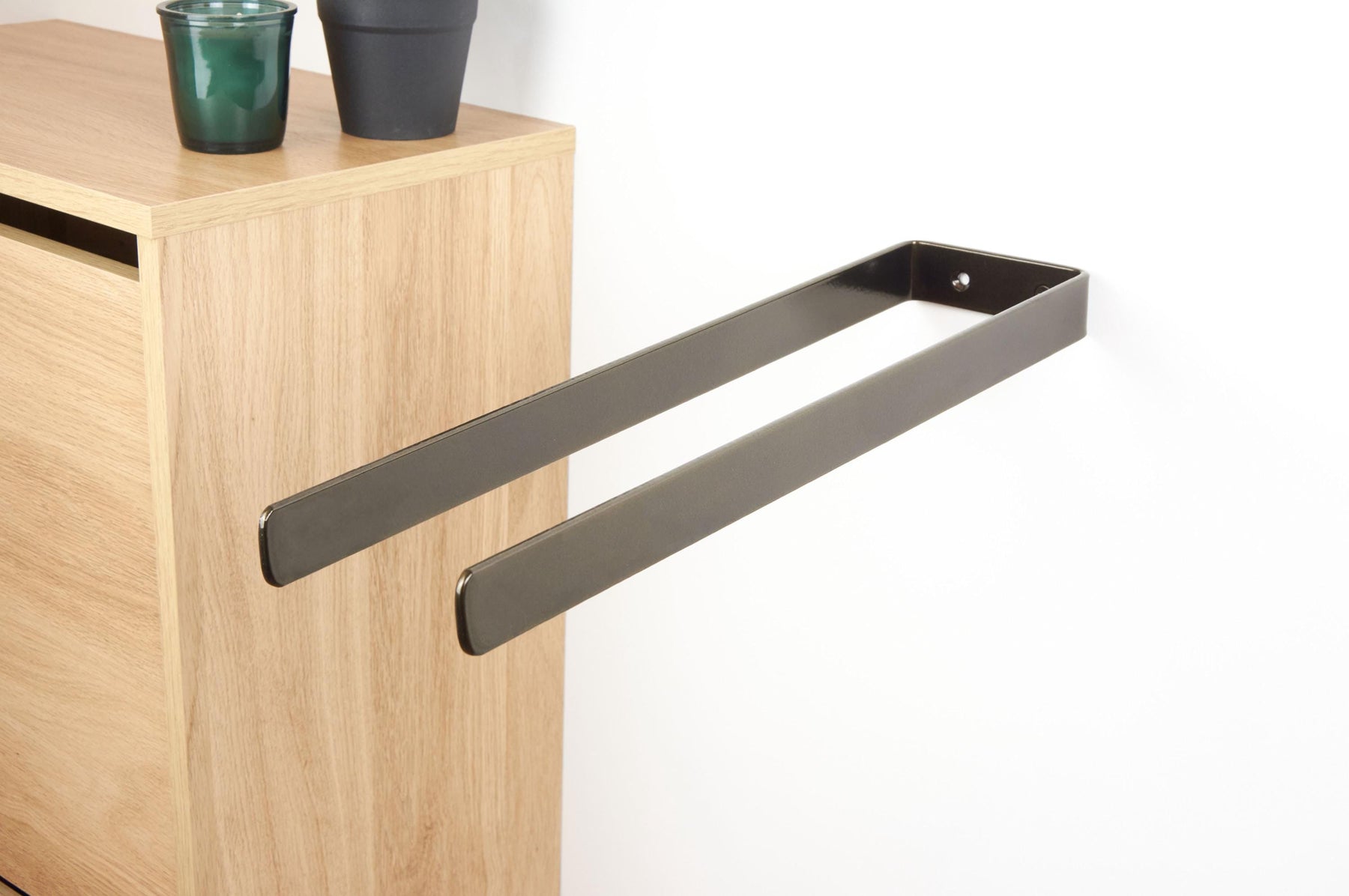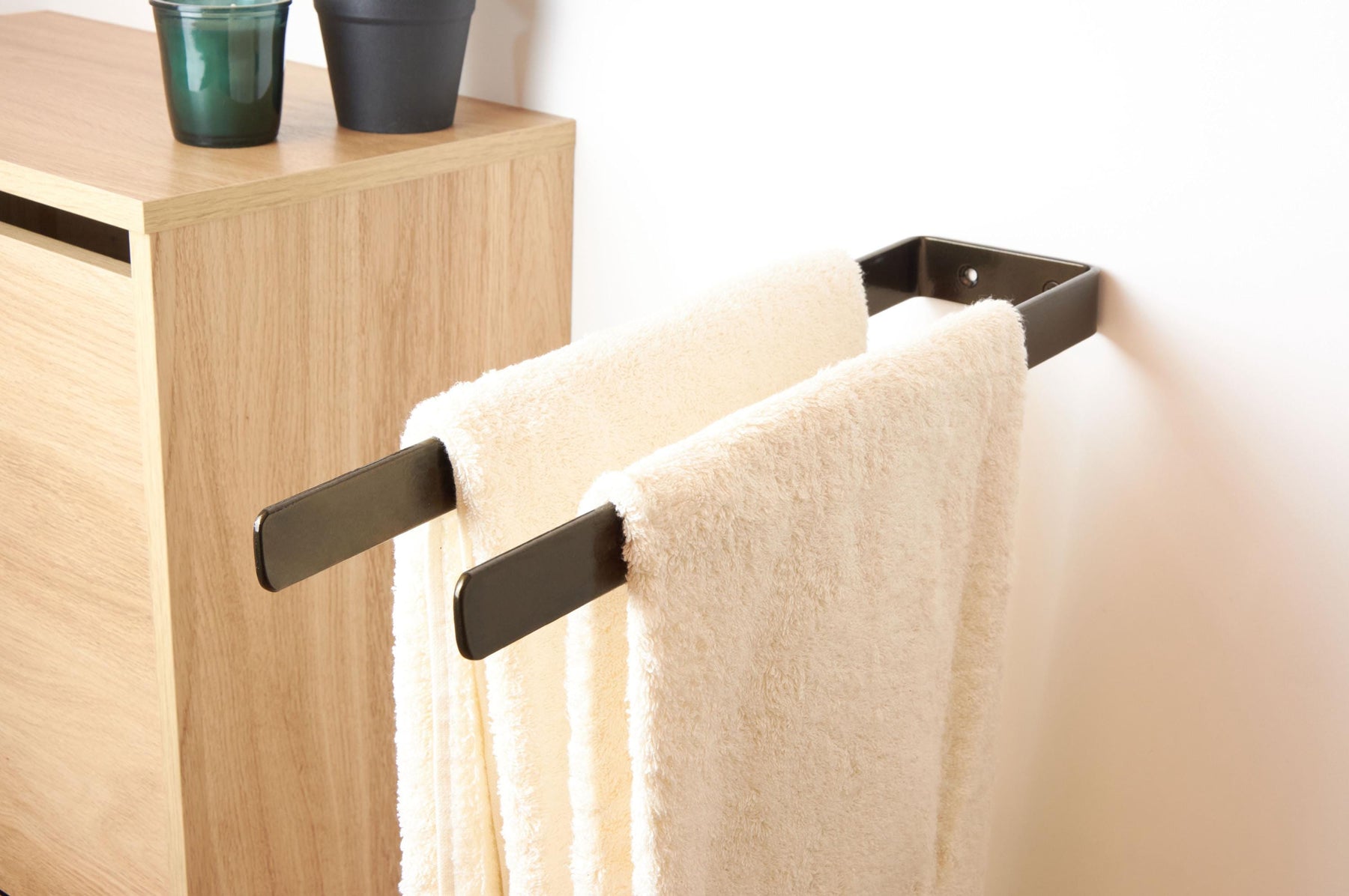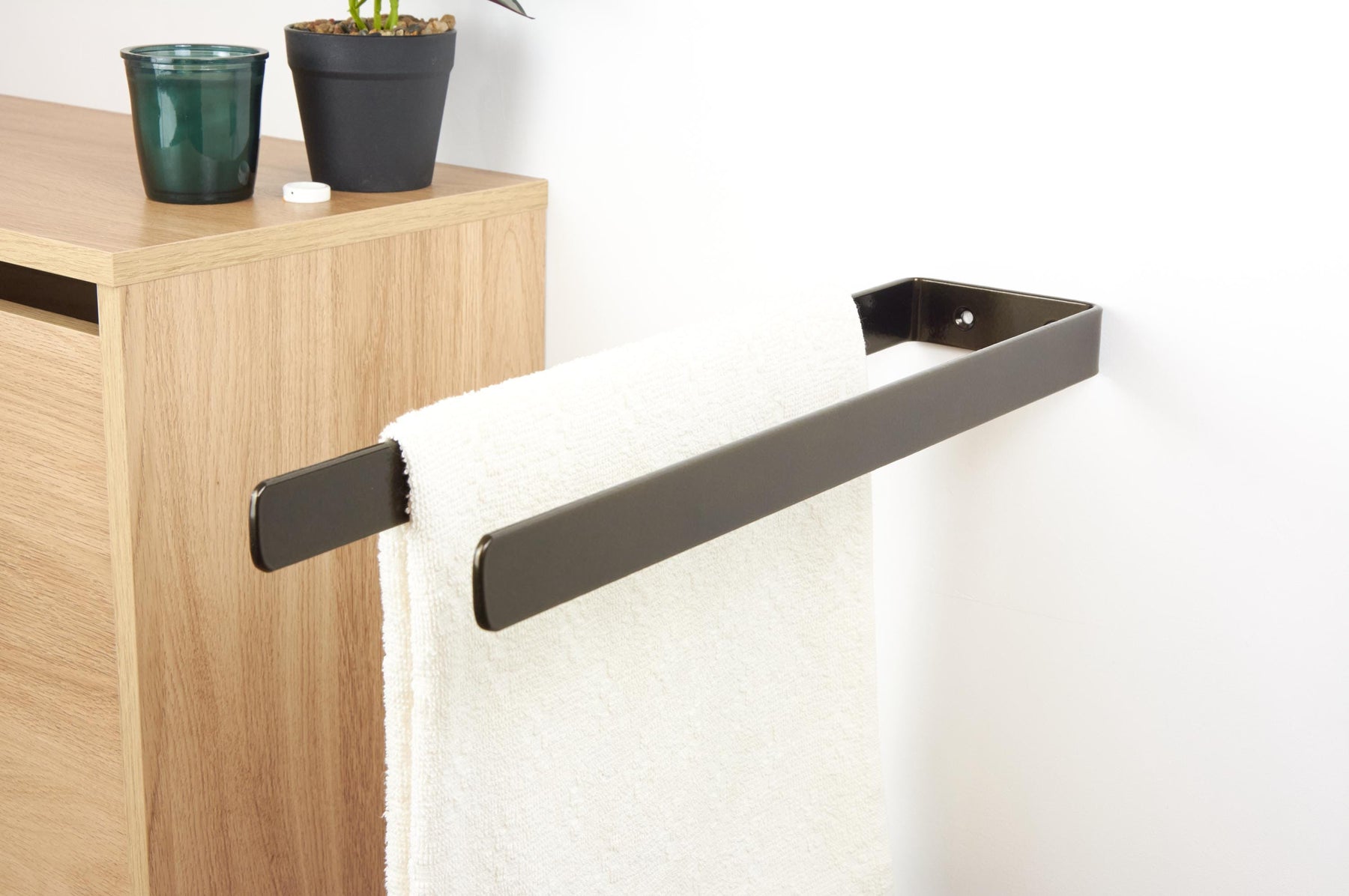 A white towel is hanging on a black towel rack, which is mounted on a wooden cabinet.