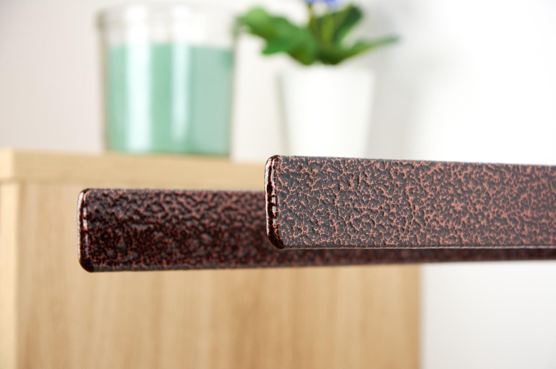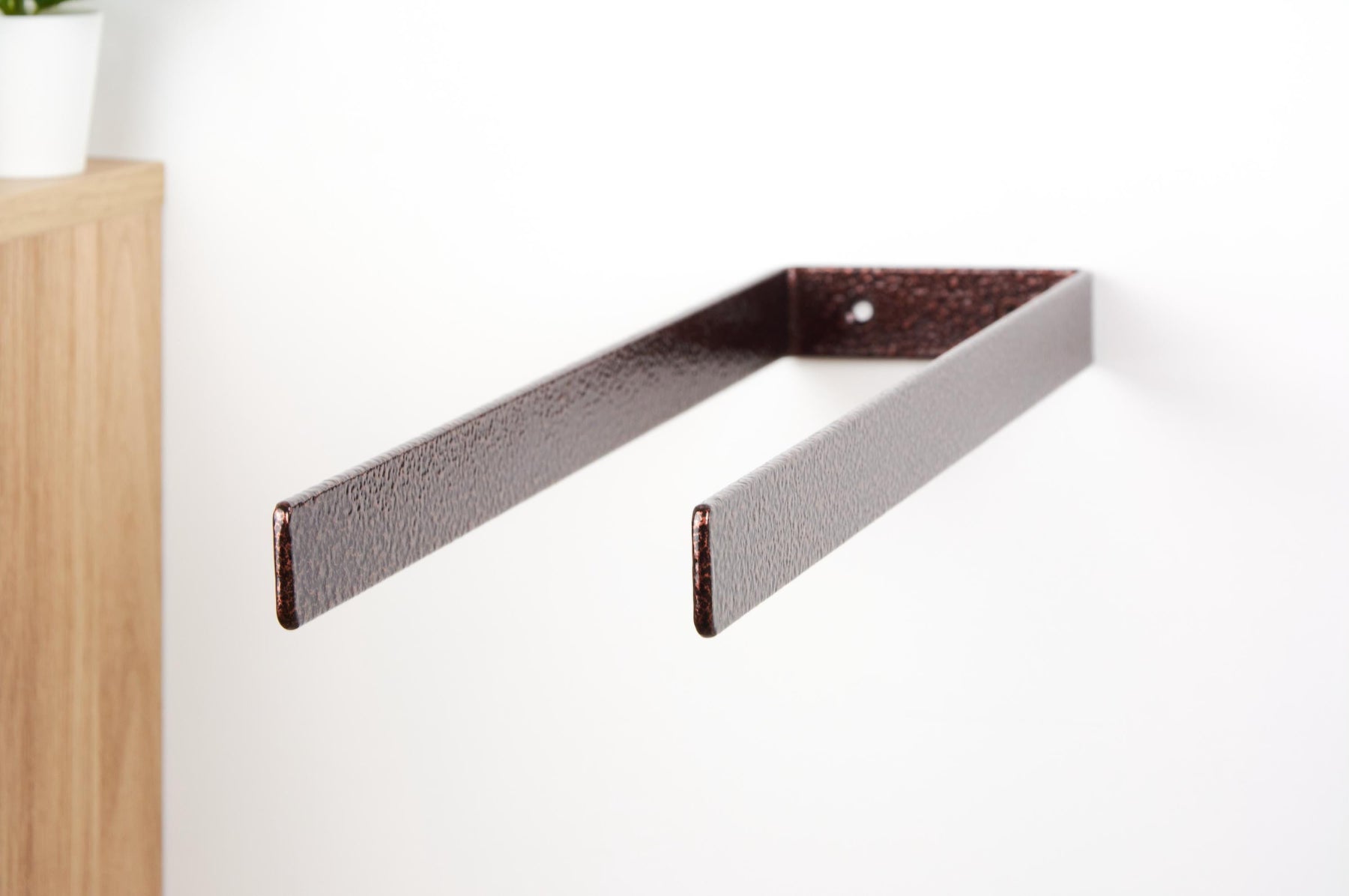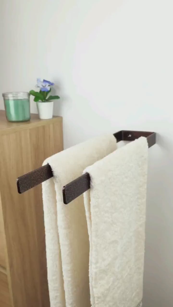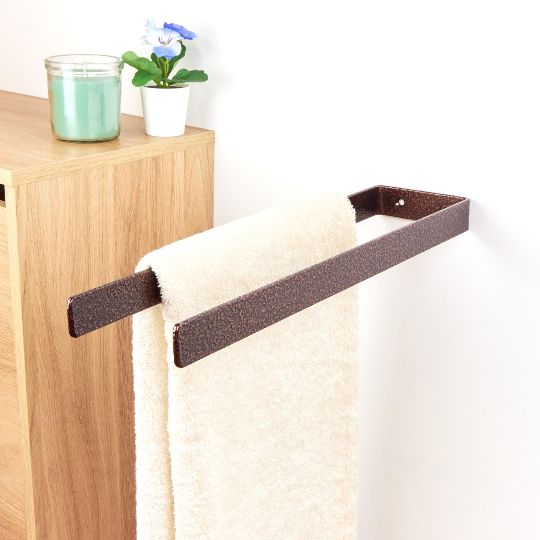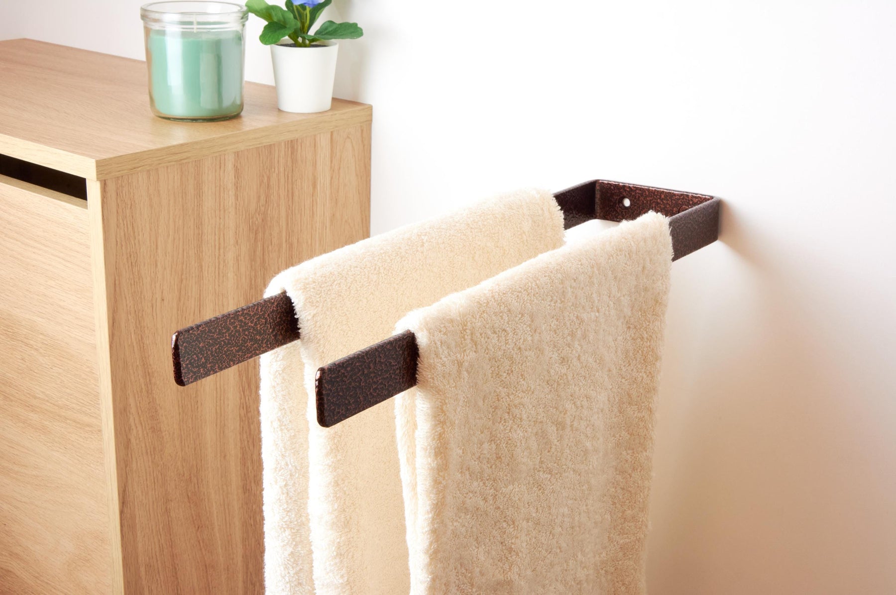 This metal double towel holder is a sleek wall mounted bathroom towel rack and a practical piece of home bath hardware for everyday use! The color of the product in the pictures is Antique Copper.