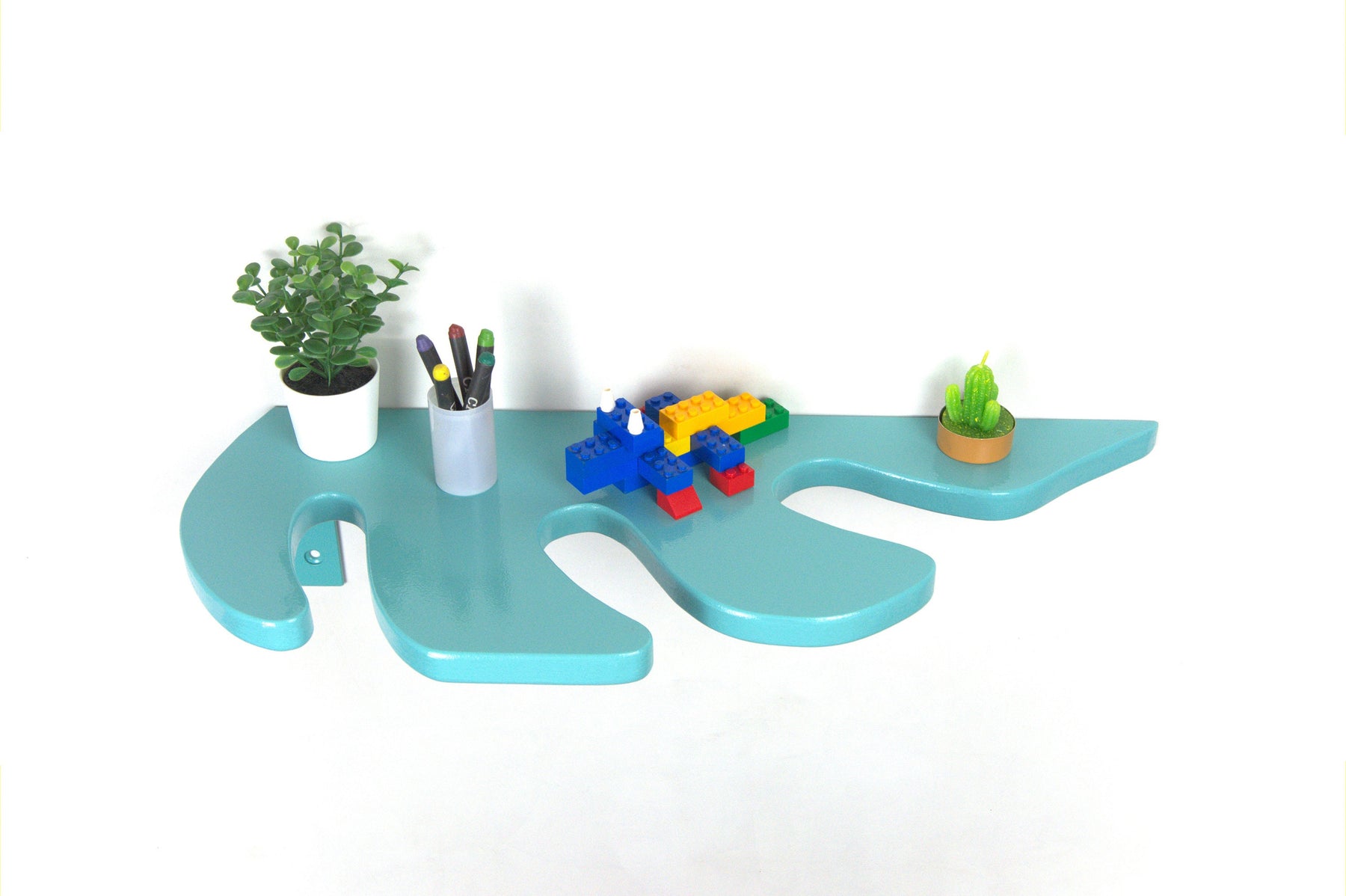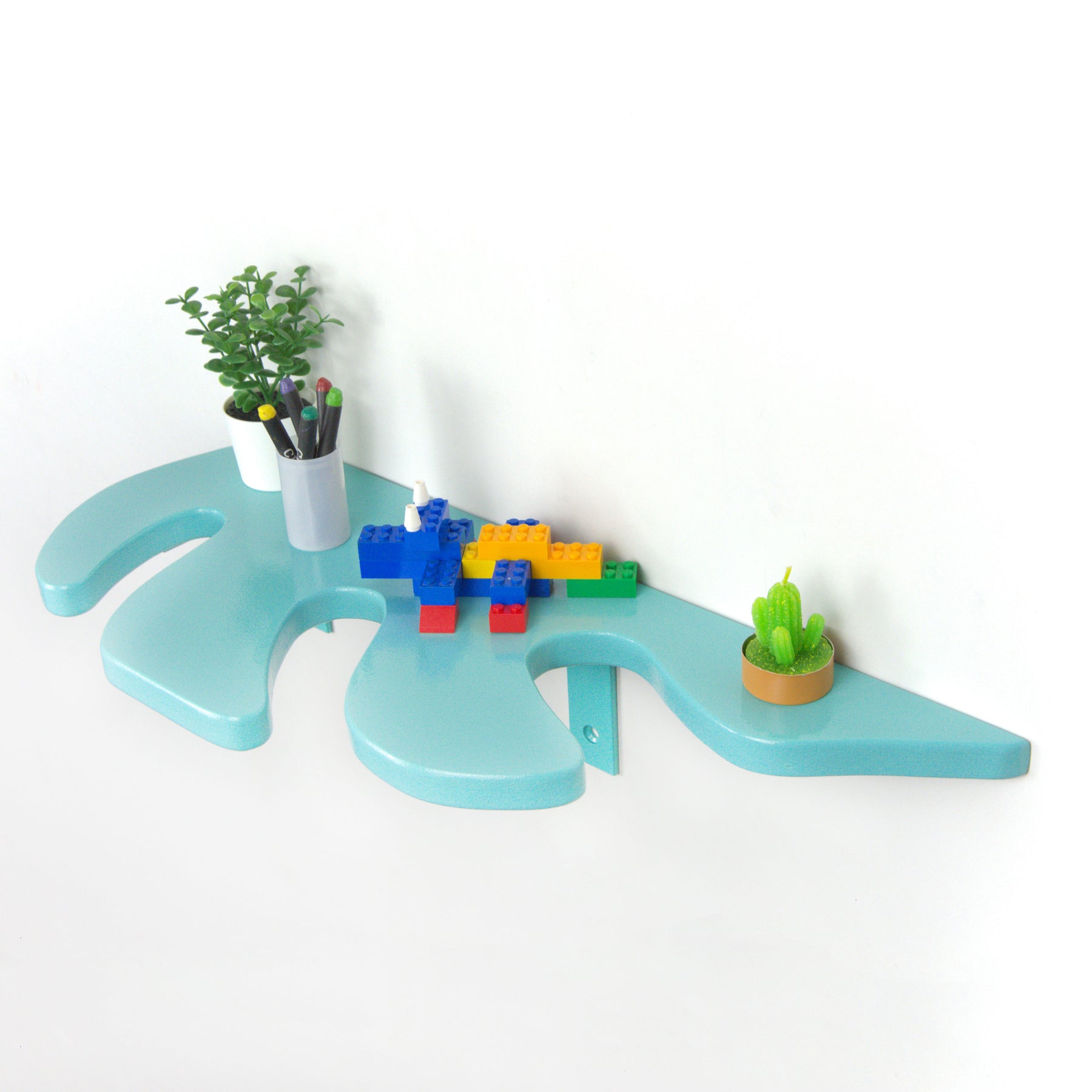a shelf with a teal-colored design, holding various objects such as a potted plant, a toy, and a cactus.